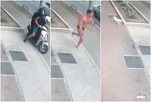 Može se videti razbojnik u crnom kako je sa torbom istrčao i pojurio ka skuteru.