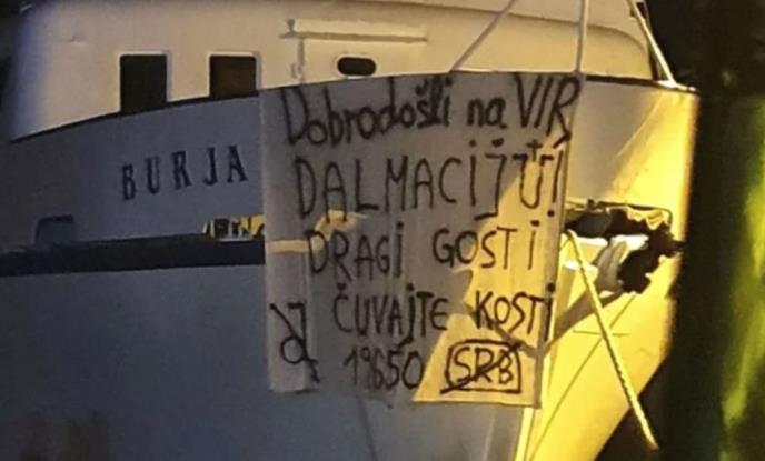 "Dobrodošli na Vir, Dalmaciju! Dragi gosti čuvajte kosti", stoji na transparentu obešenom na brod uz precrtan znak Dinama, precrtan natpis "SRB" i ustaško "U".