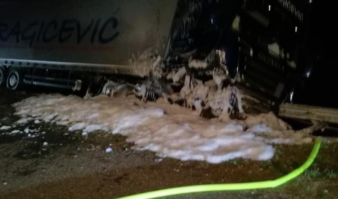 U saobraćajnoj nesreći na autoputu kod Slavonskog Broda u Hrvatskoj dve osobe su teško povređene kada je teretnom vozilu sa srpskim tablicama pukla guma, saopštila je danas policija.