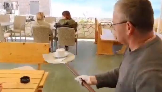 Na videosnimci zaposlenik hotela Biševo gostu donosi kavu na lopati te mu je pažljivo pruža.