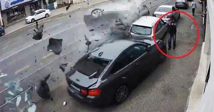 Na snimku sigurnosne kamere vidi se silina udara u parkirana vozila, ali i neverovatna sreća prolaznika koji je bukvalno za dlaku izbegao udar.