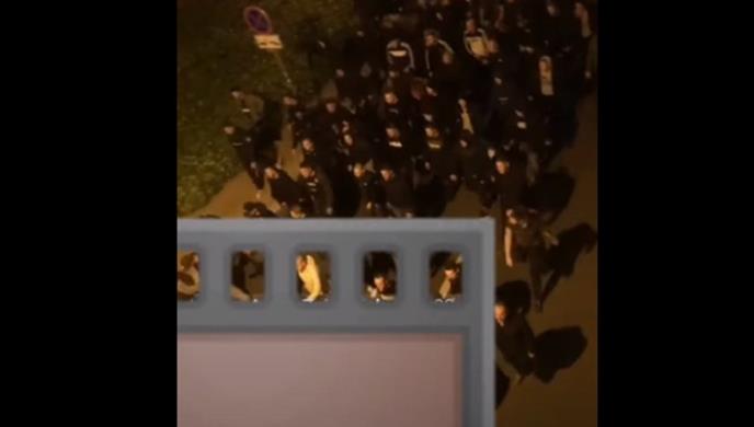 Na videu snimljenom s visine vidi se grupa od nekoliko desetina ljudi, pretežno muškaraca, koji šetaju ulicom i skandiraju.