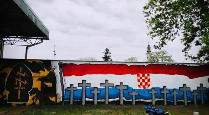 Dabas u centru Borova sela uz obezbeđenje pedesetak policajaca pripadnici navijačke grupe "Dinama" iz Zagreba, Bed blu bojsi, su nacrtali sibole.