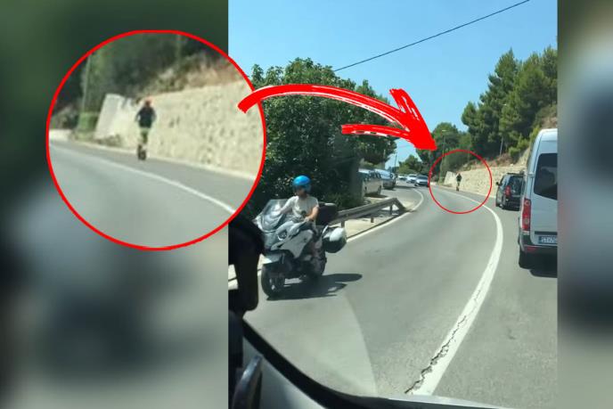 Na video snimku objavljenom na Fejsbuk stranici "Prometne zgode i nezgode" vidi se kolona na magistrali kod Lokve Rogoznice u Hrvatskoj, odnosno nekoliko automobila koji se kreću nešto sporije nego vozila iz suprotnog smera i to zbog - vozača električnog trotineta.