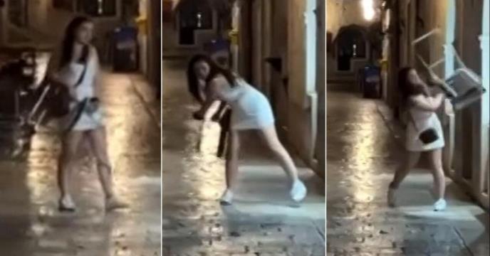 Prema izjavama očevidaca, očigledno pijana turistkinja uzela je stolicu sa terase zatvorenog restorana i njom počela da udara po zidu. Vičući na sav glas devojka je pokušala stolicom da razbije izlog ali ga je promašila.