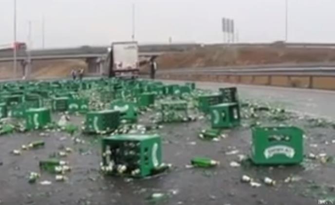 Navodi se da su na jednom od kružnih tokova u tom gradu iz kamiona koji je prevozio pivo izletele desetine gajbi, a pivo se razlilo po putu.
