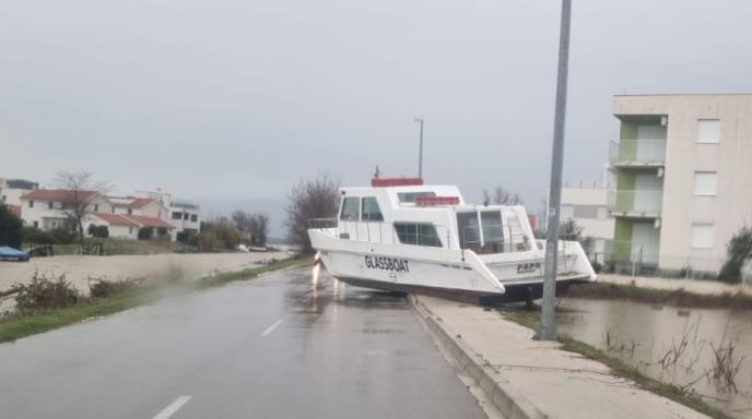 Tokom jučerašnjeg nevremena u Ninu u Hrvatskoj se na ulicu nasukao turistički brod. Do danas brod nije pomaknut sa puta i vozači moraju da ga zaobilaze.