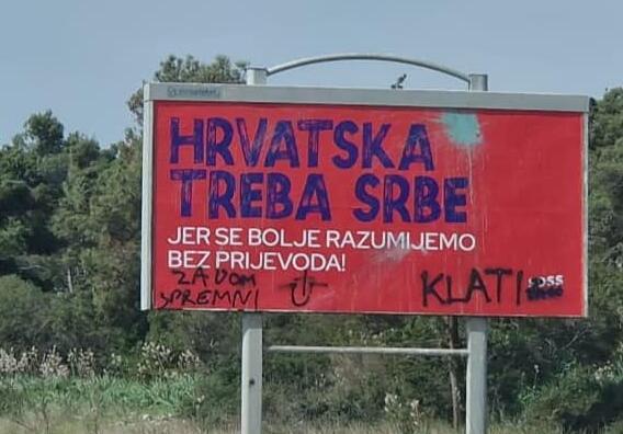 Na plakatu snimljenom uz put koji iz Zadra vodi ka Ninu, sa tekstom "Hrvatska treba Srbe - jer se bolje razumijemo bez prijevoda", dopisano je "Za dom spremni", "Klati", ustaško U i izbrisana je skraćenica SDSS na ćirilici.
