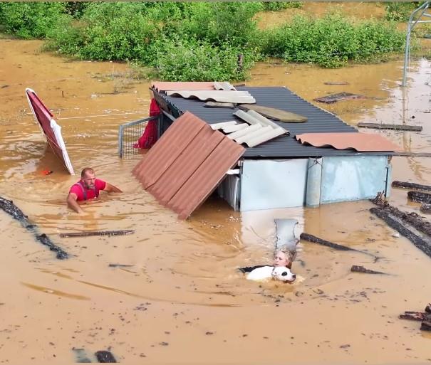 Koliko ljubav prema životinjama može biti velika najbolje pokazuje nedavni snimak nastao u Hrvatskoj, kada je jedna Sanja, prilikom obilnih kiša koje su nedavno pogodile područje Kimpi kod grada Krka, ušla u bujicu kako bi spasila svoja dva psa.