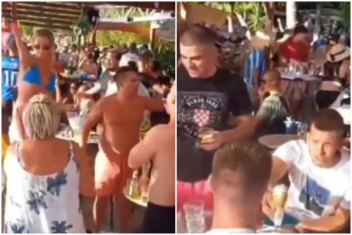 Na snimku koji je nastao na primorju, vidi se velika grupa ljudi koja u baru na plaži iz sveg glasa peva ustašku pesmu "Jasenovac i Gradiška stara":