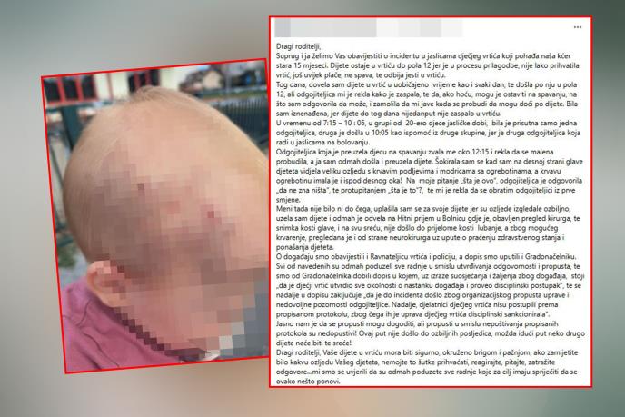 Podsetimo, kada je Zrinka K. M. došla po svoju petnaestomesečnu ćerku u vrtić, dočekala ju je velika povreda na desnoj strani glave deteta sa modricama, podlivima i ogrebotinama. Devojčica je imala i krvavu ogrebotinu ispod desnog oka, a učiteljica nije dala objašnjenje.