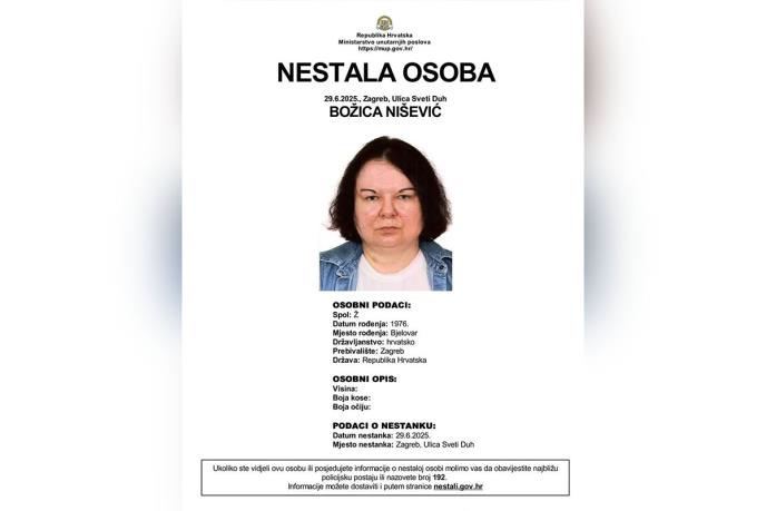 - U slučaju da posedujete informacije o osobi s fotografije, molimo vas da obavestite najbližu policijsku stanicu ili nazovete broj 192. Takođe, informacije možete dostaviti i putem e-mail adrese: nestali@nestali.hr - apeluju iz policije koja je nestanak Božice Nišević objavila na svojim stranicama.