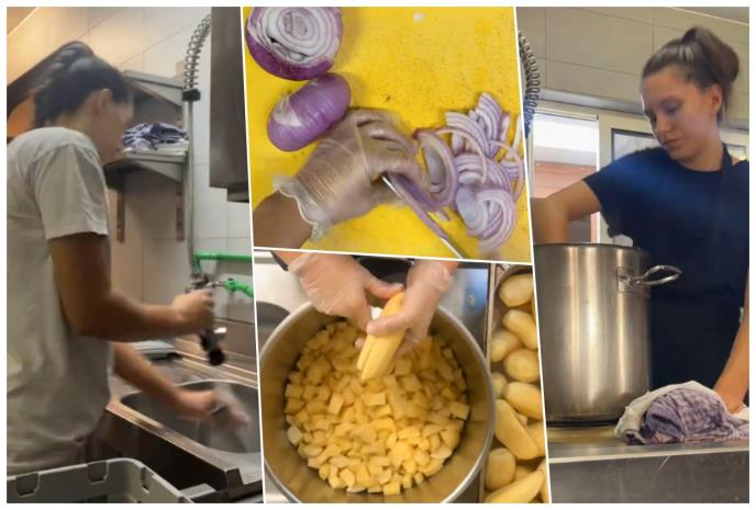 Na posao je stizala u sedam ujutru, a prvi zadaci bili su vezani uz pripremu namirnica s popisa. Snimila je kako započinje kuvanje hobotnice i krompira te rezanje povrća.