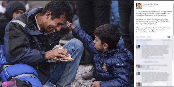 Mališan pokušava da smiri neutešnog oca koji plače dok jede skromni sendvič sedeći na zemlji.Fotografija je preko stranice "Humans of the Refuge" obišla svet. Ovaj tužni prizor snimljen je posle odluke makedonije da ne prima izbeglice koje ne dolaze iz zemalja pogođenih ratom, odnosno sirije, Avganistana ili Iraka.