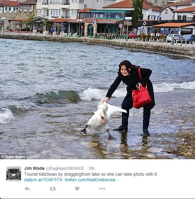 Jedna bugarska turistkinja u Makedoniji poželela je da se fotografiše sa labudom, pa ga je hvatala po Ohridskom jezeru i povredila. Nakon fotografisanja, ostavila je pticu da ugine.