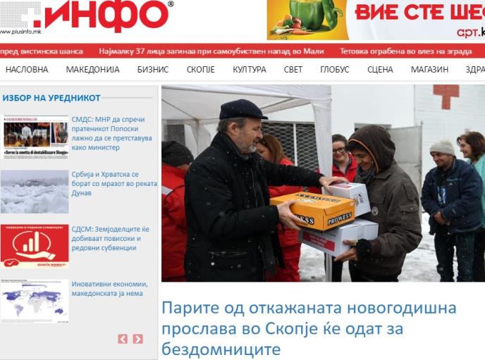Gradonačelnik Skoplja Koce Trajanovski najavio je da će gradske vlasti donirati novac od otkazane javne proslave Nove godine za proširenje kapaciteta skloništa za beskušnike u Mominom Potoku.