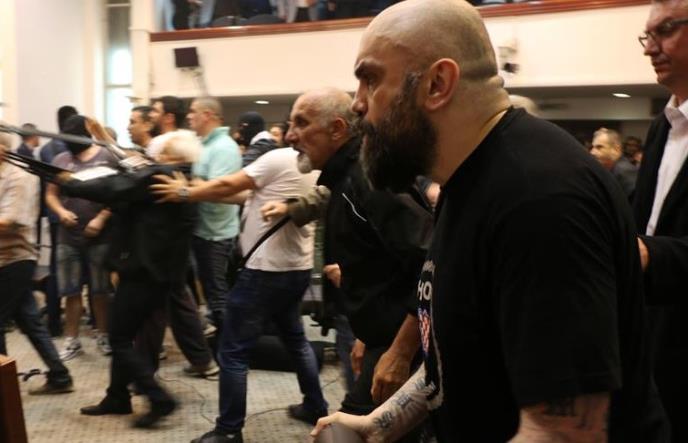 SKOPLJE - Napetost u Makedoniji ne jenjava, a na društvenim mrežama su se pojavili dokazi, odnosno slika huligana koji u makedonskom Sobranju napada poslanike, a nosi majicu sa simbolima ustaškog HOS-a!