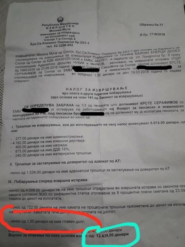 Sudske izvršitelje da naplate zaostali dug od 1 denara poslala je firma BEG koja isporučuje toplotnu energiju. Izvršitelj Monika Muča , aktivirala je nalog za naplatu, kojim mu je stavljena zabrana na 1/3 penzije, i naplatu duga od 12.439 denara.
