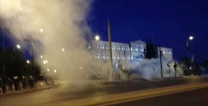 Tokom protesta ispred grčkog parlamenta došlo je do incidenta pošto je grupa maskiranih ljudi napala policiju pirotehničkim sredstima i gađala policiiju kamenjem, plastičnim flašama.