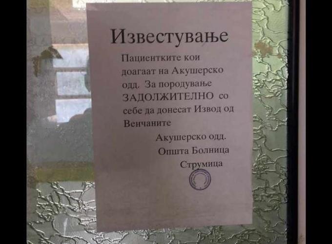 Naime uprava bolnice napisala je da "pacijentkinje koji dolaze da se porode moraju da donesu sa sobom i izvod iz knjige venčanih". Pri tom reč "obavezno" je posebno naglašena i napisana velikim slovima.