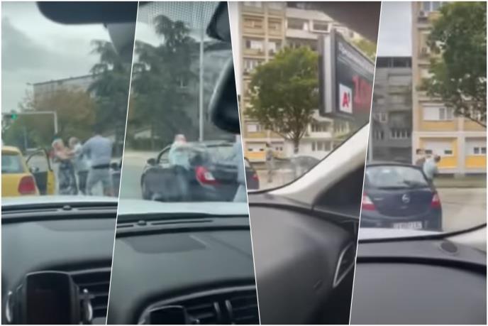 Na snimku incidenta vidi se mlađi vozač koji se tuče sa suprugom žene, koja je odgurnuta i pada na zemlju dok pokušava da ih razdvoji.