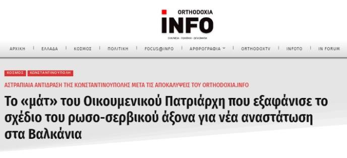 Crkveni portal „Ortodoksija. info” u tekstu pod naslovom „Šah” vaseljenskog patrijarha koji je izbrisao plan rusko-srpske osovine za nove turbulencije na Balkanu, piše da se odlukom Svetog sinoda Vaseljenske patrijaršije „završava dugogodišnje peripetije raskolničke crkve koju je obnovio u okviru kanonske pravoslavne crkve.