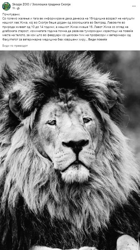 To je na Fejsbuku objavio Skopski zoološki vrt, navodeći da da je Žika sa 16 godina bio u dobukoj starosti, jer lavovi u prirodi žive od 10 do 14 godina.