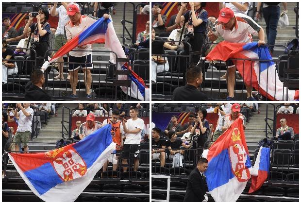 Obezbeđenje je u jednom trenutku intervenisalo kako bi sprečilo jednog navijača iz Kine da okači na ogradu zastavu Srbije.