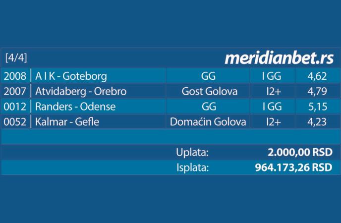 Međutim, brze igre nisu samo na uživo klađenju već i u standardnoj ponudi. Prvo poluvreme na golove ili GG u prvom su odlično plaćene kvote. To je prepoznao Novosađanin i uplatio na 4 meča 2000 RSD. Mnogi će reći hrabro, ali isplata je neverovatna - 964 000 RSD, pa se igraču iz Meridiana rizik više nego isplatio. Najmanja kvota 4.23, najveća 5.15. Neko se ne bi usudio da ih singlira, ali opet potvrđena teorija - Sreća prati hrabre!