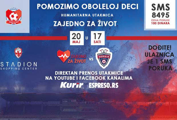 Humanitarna utakmica pod nazivom „Zajedno za život” u kojoj će se sastati najveće fudbalske, glumačke i pevačke zvezde u Srbiji igraće se u nedelju, 20. maja, sa početkom u 17h na stadionu Voždovca u Beogradu. Ulaznicu za ovaj humanitarni spektakl moći ćete da kupite na ulazu stadiona jednom porukom na humanitarni SMS broj 8495, a sav prihod namenjen je „Fondu za pomoć pri lečenju dece u zemlji i inostranstvu” koji je osnovala Humanitarna organizacija „Zajedno za život”. Svi koji neće moći da dođu na stadion, moći će utakmicu uživo da prate na facebook i youtube kanalima Kurira i Espresa.
