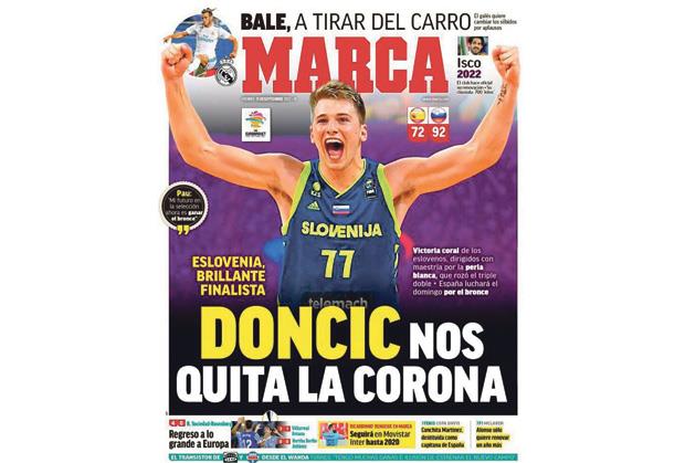 Španski novinari su kao glavnog dželata „crvene furije“ u Turskoj označili mladog košarkaša Slovenije Luku Dončića, inače člana Reala iz Madrida. Posvetili su mu naslovnu stranu, s naslovom „Dončić nam oteo krunu“! Dalje su opisali njegovu briljantnu partiju, uz učinak od 11 poena, 12 skokova i osam asistencija. Bio je tako blizu tripl-dabl učinka. Ipak, jedan statistički podatak najbolje pokazuje njegovu sjajnu partiju - nije imao izgubljenu loptu!