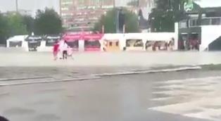 Na snimku, čiji autori tvrde da je iz kišovitog Lila, se vidi da se jedan engleski huligan zaleteo i klizećim startom oborio dvoje prolaznika.