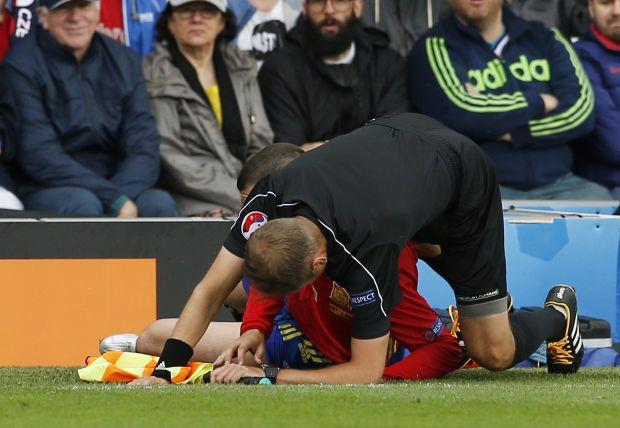 Španski fudbaler Alvaro Morata je na početku meča prvog kola grupe D protiv Češke u žaru borbe pokosio pomoćnog sudiju.