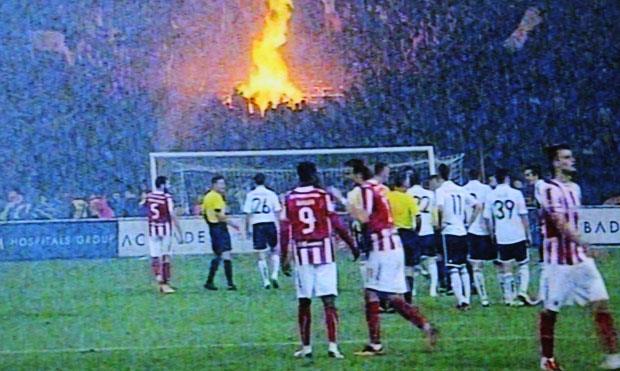 "Grobari" su iskoristili koreografiju kojom su obeležili početak meča, pa je vatra trajala dobrih desetak minuta. Vatrogasci su intervenisali i ugasili vatru, a utakmica je bila u prekidu upravo toliko.