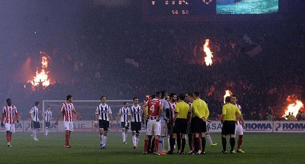 Oko pola sata pre početka "večitog derbija" došlo je do sukoba izmedu dve frakcije navijaca Partizana, "Zabranjenih" i "Alkatraza", a utakmica je u 53. miniutu prekinua pošto su navijači crno-belih na južnoj tribini zapalili veliku vatru.