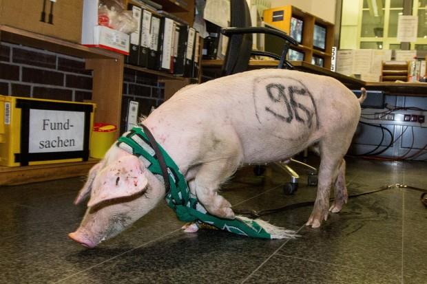 HANOVER - Policija u nemačkom gradu Hanoveru imala je danas neobičan zadatak, pošto je morala da "privede" svinju koja je oko vrata imala šal istoimenog lokalnog fudbalskog kluba.