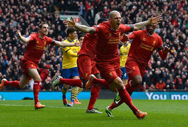 Liverpul je na 2:0 povisio u 10. minutu. Džerard je ponovo loptu ubacio u kazneni prostor Arsenala, a Škrtel je glavom pogodio mrežu gostiju. Samo dva minuta kasnije nova šansa za Liverpul, ali je Suarez bio neprecizan. Na 3:0 povisio je Sterling u 17. minutu. U 20. minutu već je bilo 4:0 za Liverpul. Posle odlične kontre domaćih igrača pogodio je Staridž. Do kraja prvog poluvremena nije bilo promene rezultata, iako su domaći imali još nekoliko šansi.