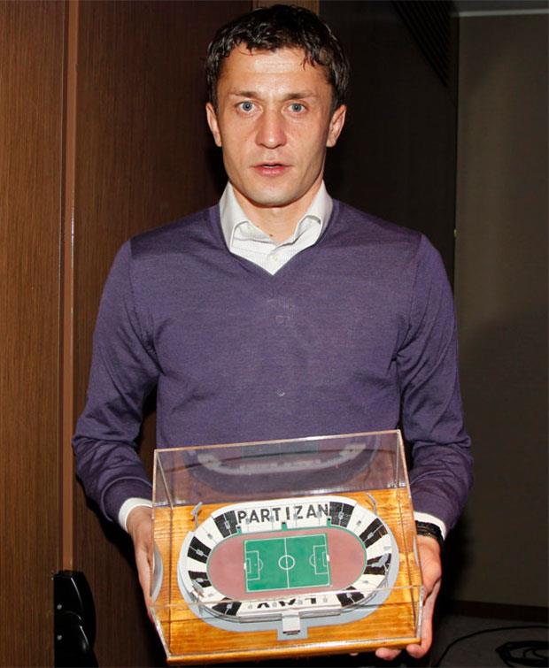 Direktor za marketing komunikacije kompanije Kalsberg Srbija Andre Žak uručio je kapitenima crno i crveno-belih maketu stadiona Partizana sa crno-belim stolicama, odnosno maketu ključa autobusa.