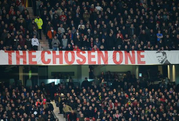 "Izabran" (The Chosen one) dominira na Old Trafordu na svakoj utakmici ove sezone. Transparent je okačen da leu stadiona "Stretford end" kao podršku Aleksu Fergusonu koji je izabrao Mojesa za njegovog naslednika.