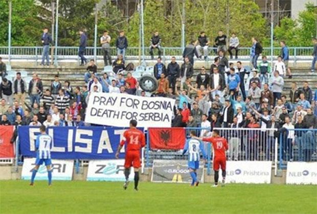 Albanski navijači su tokom utakmice 31. kola tzv. lige Kosova istakli transparent na kojem je na engleskom pisalo: "Molitva za Bosnu, smrt Srbiji".