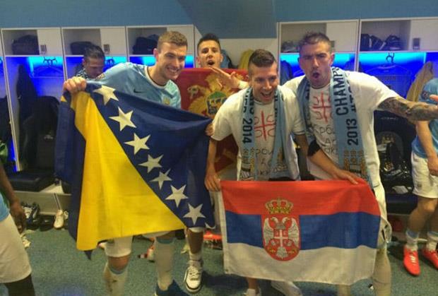 Zanimljivo je da se na slici pored Kolarova i Nastasića nalazi i Edin Džeko, kome ni najmanje ne smeta natpis na majicama