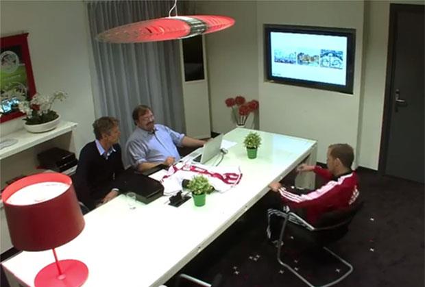 S jedne strane stola bio je Edvin van der Sar i glumac koji je iz torbe izvlačio dresove. Na drugoj strani su bili trener Ajaksa Frank de Bur, kao i igrači De Jong, Blind i Kilesen.