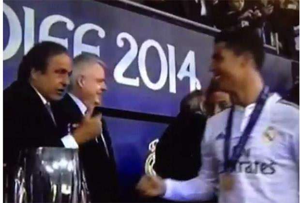 Prvi čovek evropskog fudbala nije video da Kristijano Ronaldo već ima jednu medalju oko vrata, pa je krenuo da mu da i drugu. Portugalac je morao da interveniše i upozori Platinija da već ima jednu medalju.