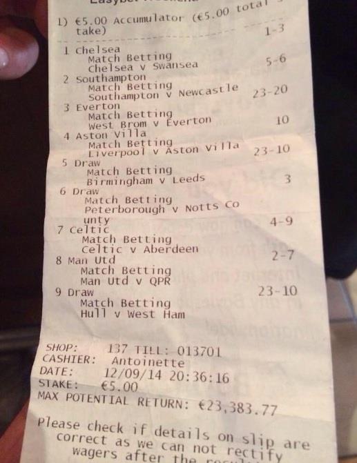 On je pogodio i remi Birmingema i Lidsa (1:1), Piterboroa i Nots Kauntija (0:0), kao i ekipa Hala i Vest Hema (2:2). Uz to na tiketu su se našle i pobede Seltika i Mančester junajteda. Seltik je savladao Aberdin (2:1), dok je Junajted bio bolji od KPR-a (4:0).