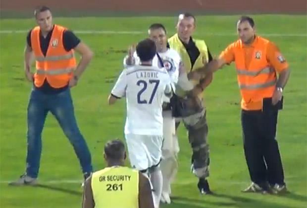 Jedan od pristalica kluba iz Humske ulice spustio se sa tribine na teren, ali su ga ubrzo opkoli redari i na prilično grub način pokušali da odvuku sa terena