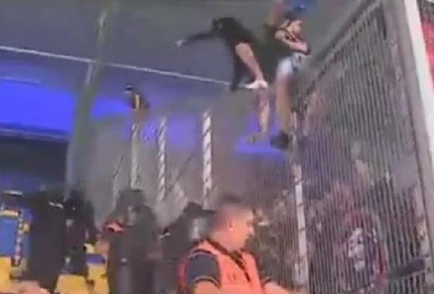 Navijači su pre početka meča napravili haos na tribinama. Sve je počelo tako što su domaći navijači zasuli rivale bakljama, kamenicama i stolicama.
