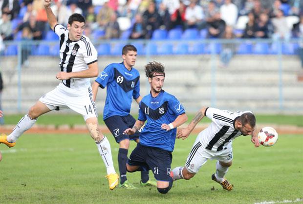 Fudbaleri Mladosti napadaju iz svih pozicija, dok se Partizan brani.