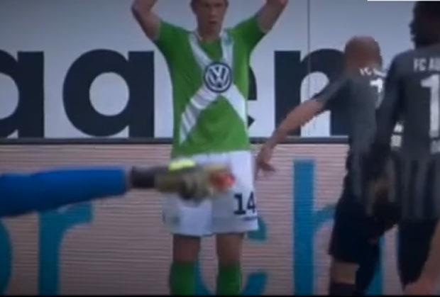 AUGSBURG - Fudbaler Augsburga Tobijas Verner pogodio je kopačkom u međunožje igrača Volfsburga Kevina de Brujna tokom meča 7. kola Bundeslige.