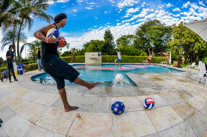 (VIDEO) UVRNUTA ZABAVA: Ronaldinjo šutira lopte na momke koji pretrčavaju bazen
