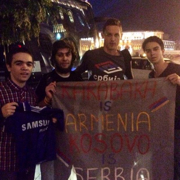 Navijači Jermenije su se slikali sa reprezentativcem Srbije Nemanjom Matićem, a imali su transparent na kome je pisalo: "Karabah je Jermenija, Kosovo je Srbija".